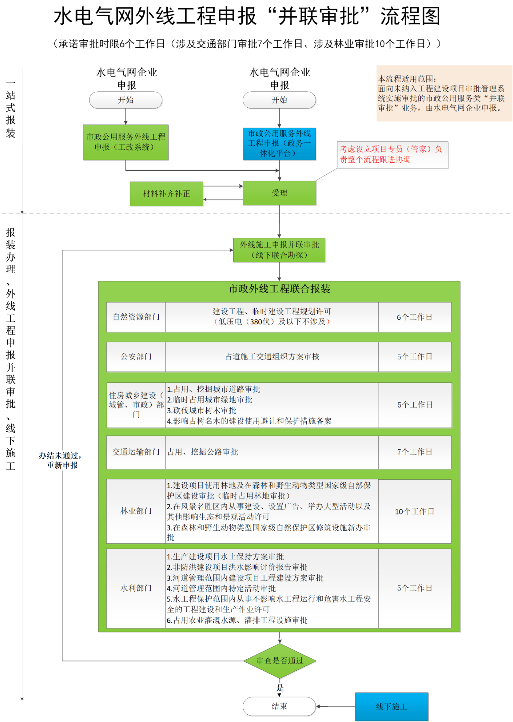 (二)水电气网市政单位申报外线工程报装业务,按附件4-2《水电气网外线工程“并联审批”流程图》办理。