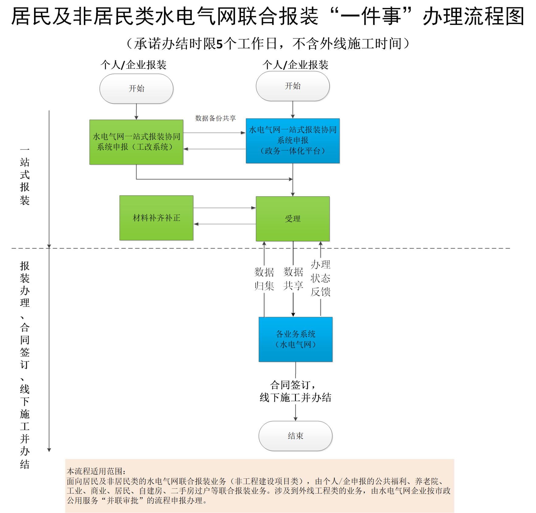 (三)居民及非居民类水电气网联合报装业务,由个人/企业申请水电气网联合报装业务,按附件4-3《居民及非居民类水电气网联合报装“一件事”》办理。